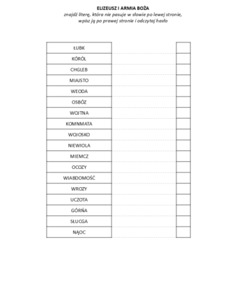 Zadanie polega na wyszukaniu nie pasujących liter w słowach z tej historii, a następnie ułożenie z tych liter hasła. Przygotowane jest dla dzieci w wieku 6-12 lat.