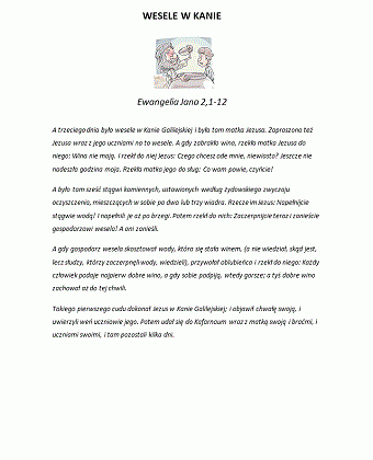 Zestaw zadań do historii o pierwszym cudzie Jezusa, który dokonał na weselu w Kanie Galilejskiej. Jezus, jego matka i jego uczniowie zostali zaproszeni na wesele. Tam matka Jezusa powiedziała Mu, że zabrakło wina. Jezus kazał sługom nalać wody do stągwi, potem zaczerpnąć i zanieść gospodarzowi wesela. Gospodarz po spróbowaniu wody, która zamieniła się w wino, zawołał oblubieńca mówiąc mu, że przecież zwykle najlepsze wino daje się na początku wesela a nie na końcu. To był pierwszy cud Jezusa.